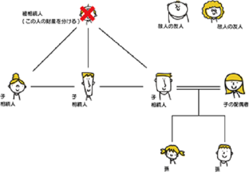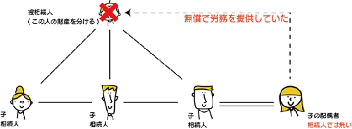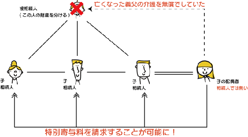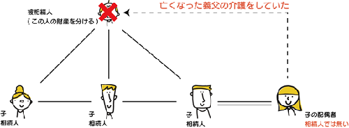 上図の場合、子の配偶者のみが相続人ではありません。この方が先の例で取り上げたように、亡くなった方の介護や看病をしていた場合、特別寄与者となります。