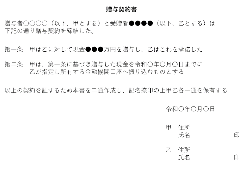 また暦年贈与を行う場合にはたとえ親子間の贈与であっても契約書を用意すると良いでしょう。契約書の例も作成しましたので、下記をご覧ください。