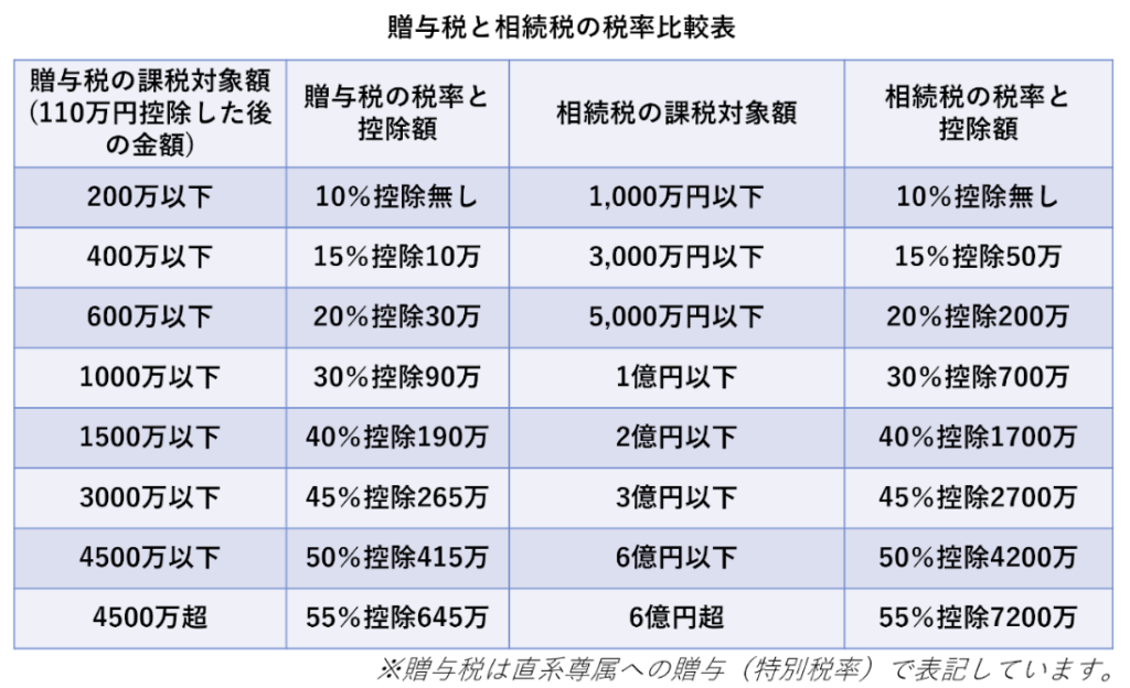 上表はよく比較されることのある、贈与税と相続税の税率表です。