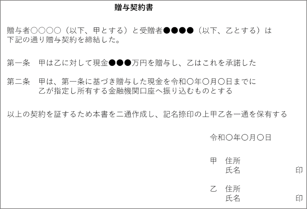 また暦年贈与を行う場合にはたとえ親子間の贈与であっても契約書を用意すると良いでしょう。契約書の例も作成しましたので、下記をご覧ください。