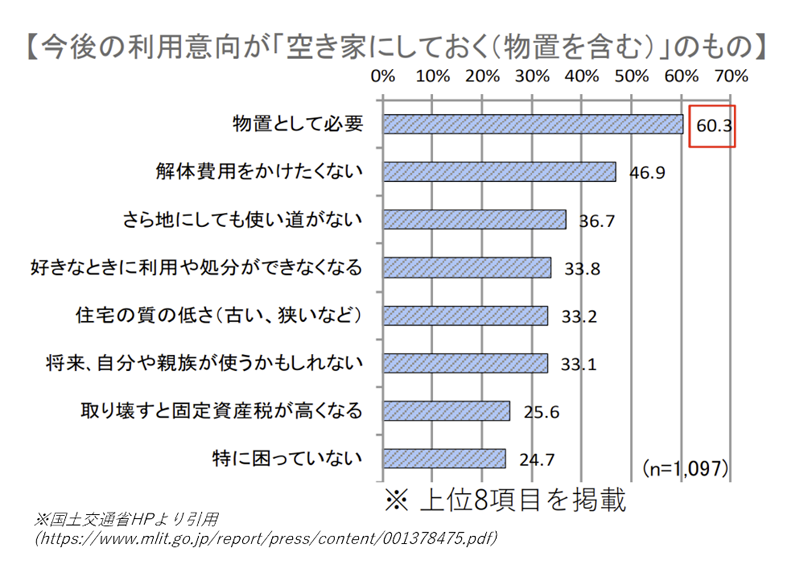 上図は国土交通省の調査結果です。「なぜ空き家にしておくのか?」ということに対する所有者からの答えは様々ですが、使用する予定は無いけれども費用や使いみちについて悩みを抱えている方が多くいらっしゃるということが分かります。