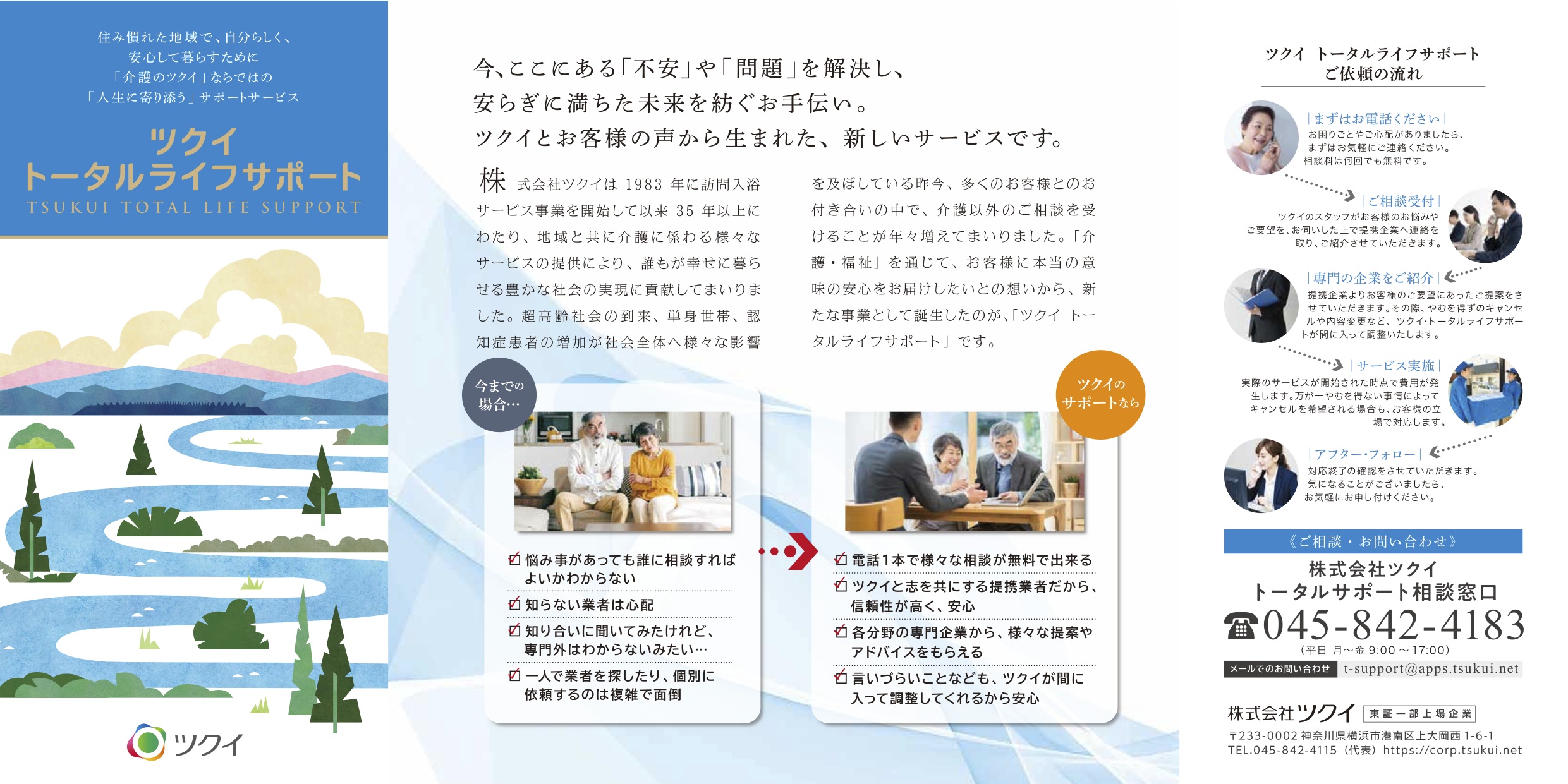 株式会社ツクイは、「今、ここにある『不安』や『問題』を解決し、安らぎに満ちた未来を紡ぐお手伝い。ツクイのお客様の声から生まれた、新しいサービスです。」と題して、介護以外のご相談を受ける新たな事業として「ツクイ トータルライフサポート」を始めました。